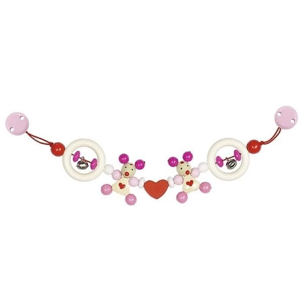 Pour les touts petits voyageurs, cette magnifique Chaîne de Poussette à clipper en bois Heimess ‘Chaîne Poussette avec clips Mes Souris Roses Heimess’ de la série Souris Roses, est magnifiquement décorée.  2 petites copines en bois de hêtre aux couleurs de bonbon, toutes brillantes et amusantes. La chaîne de poussette se compose de 2 hochets anneaux de grelots, 2 souris roses et une perle pendentif cÅ“ur…  Une belle harmonie dans les tons de roses, blanc et rouge, pour accompagner et distraire bébé en poussette et sur se chaise. . Et bien sur les clips magiques, permettent de l’accrocher au berceau ou à la poussette..