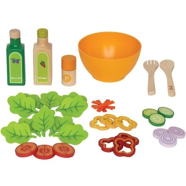 Cet ensemble comprend: 1 saladier – 2 couverts à salades – 1 flacon d’huile d’olive – 1 flacon de vinaigre – 1 salière – 10 feuilles de salades – 3 tranches de tomate – 3 tranches d’oignon – 3 tranches de concombre – 6 tranches de poivron – 5 bâtonnets de carotte.
