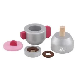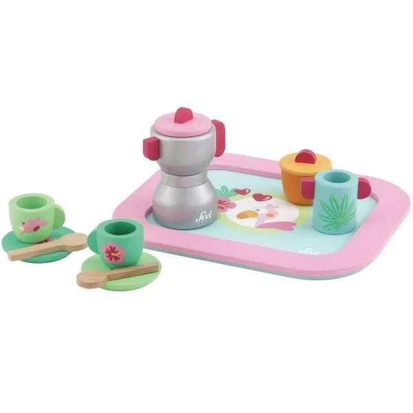 Voici un plateau de café, en bois, riche en décorations et accessoires qui augmente son attrait et l’intérêt qu’il suscite: il y a le moka, complètement amovible, pour rendre le jeu de rôle encore plus réelle, 2 tasses, le sucrier et le pot à lait! L’article se compose de 10 pièces et est décoré dans des tons de rose, de verts, et d’orangés qui s’accorderons avec tout autre ensemble.