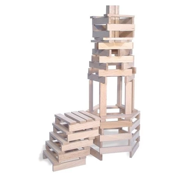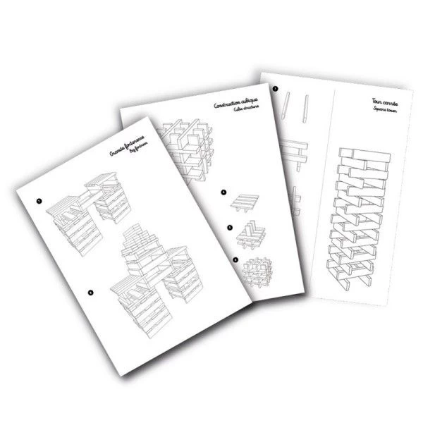 Jeu de construction en bois naturel pour développer l’imagination des enfants. 200 planchettes de 100 x 20 mm. Des modèles de construction sont inclus. Fabrication française.
