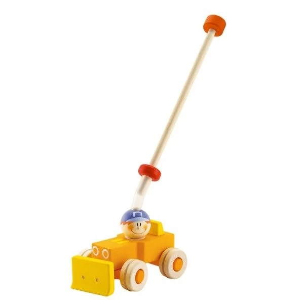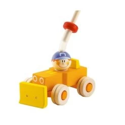 Pour les petits à partir de 18 mois, éveil émotionnel et  physique avec ce magnifique Camion Bulldozer à Pousser aux couleurs des engins de chantier (Jaune !!). Avec la canne à pousser, le camion devient un excellent moyen de solliciter la marche et la recherche d’équilibre, et sans la canne, le camion pourra se garer tranquillement au milieu des autres jouets. Un jouet ludique permettant d’acquerir et developper l’équilibre et la marche, un bon moyen de se promener partout dans la maison, et faire du ménage….Â