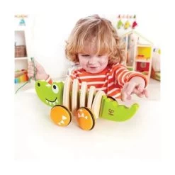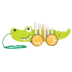 Pour les petits promeneurs à partir de 12 mois, éveil physique et émotionnel avec cet amusant Crocodile à traîner en Bois Naturel, d’un joli vert et doté d’un gentils sourire. Un Crocodile en bois qui se dandine, ondule et remue la queue en se promenant, tout en affichant un large sourire, content de suivre son acolyte…pour lui croquer le derrière!!