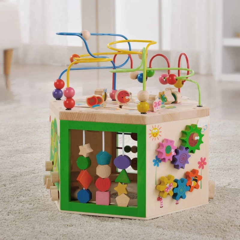 Pour les petits bambins Jardinier dès 18 mois, éveil émotionnel avec ce magnifique Jouet Cube d’éveil multi activités 7 en 1 EverEarth®, en fait un Hexagone d’activités pour encore plus de partages et de jeux. 6 faces latérales proposent tout un tas d’activités ludiques et colorées dans un décors verdoyant. Pour développer l’apprentissage des couleurs, des formes, les nombres, etc… grâce aux bouliers, boites à formes, labyrinthes, engrenages et aux magnifiques looping de perles et petits animaux du jardin. Un jouet magnifique, et imposant permettant de jouet à plusieurs, s’émerveiller de rencontres et de découvertes et apprendre à compter comme à développer sa motricité fine. Un cube hexagonale multi activités pour s’amuser sans s’en rendre compte et acquérir ses premières compétences.