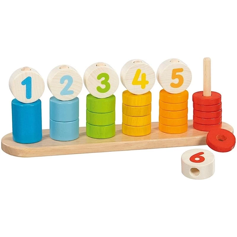 Pour les bébés dés 24 mois, pour découvrir et développer ses sens, sa compréhension des chiffres et associer les quantités, ce Jouet en Bois Apprendre à compte Arc-en-ciel Goki® est idéal. Un socle de 6 totems à enficher sur lesquels les futurs petits écoliers pourront empiler les disques de couleurs. Trier, associer les couleurs, faire la relation entre quantités et chiffres, sans oublier les notions de proportions permet d’appréhender les premières notions de calcul qui seront reprise à l’école. Les disques à enficher sur les axes en bois brut, ont une texture douce et des couleurs éclatantes, et pour amuser les petits, au dos de chaque chiffre, un sourire clownesque attend les petits travailleurs. Les pièces en bois sont colorées et permettent de découvrir couleurs et tailles. Organiser les formes et réaliser l’empilement rien de plus simple pour bébé. De la découverte de la gravité, au mélange des couleurs et des tris, bébés développe son intellect, ses sens et prend du plaisir au travers du jeu et de l’autonomie.