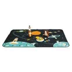 Un tapis de jeu spectaculaire sur le thème de la galaxie pour vous permettre de partir à l’aventure spatiale ! Une soucoupe volante avec un petit pilote extraterrestre vert. Une navette spatiale. Une fusée Apollo en 3 parties avec de puissants boosters.