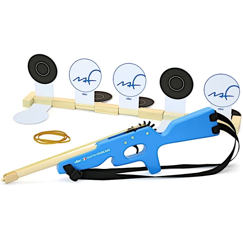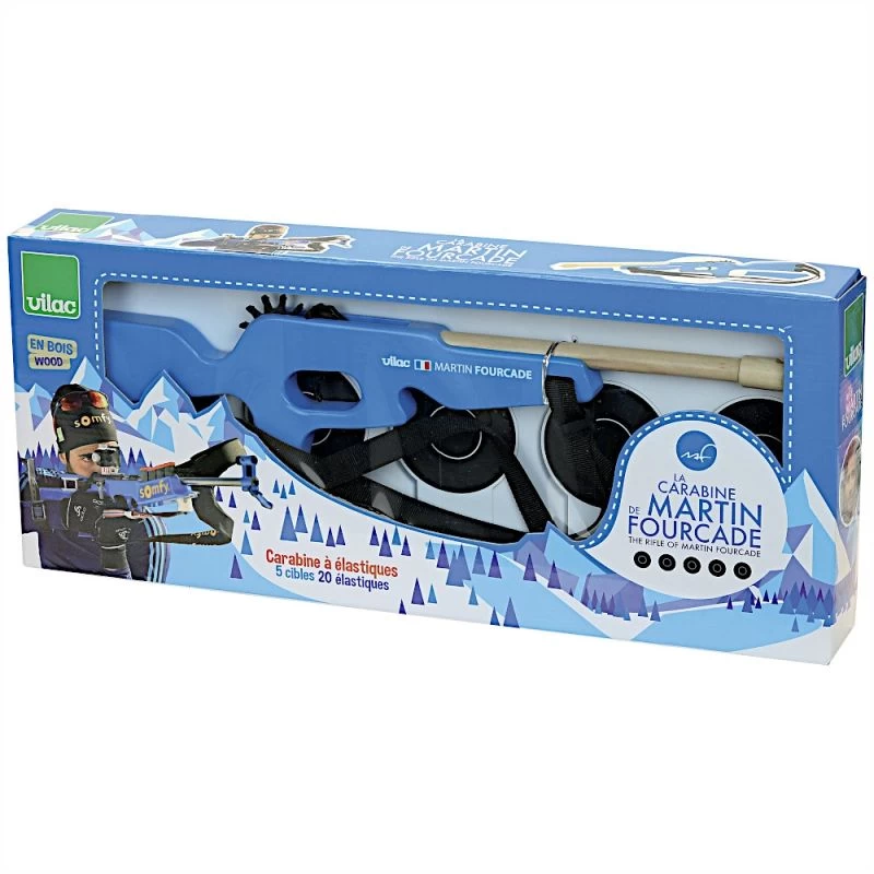 Pour les amoureux de biathlon dés 72 mois, éveil physique et adresse avec cette superbe carabine en bois vernis Vilac®, Jouet en bois Carabine Biathlon Martin Fourcade Vilac®, une carabine à élastique pour s’ exercer aux tirs et devenir précis comme le champion olympique Martin Fourcade. Les 5 cibles à bascule permettent un enchainement digne des JO! Un jouet unique et ludique aux couleurs de Martin Fourcade.