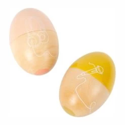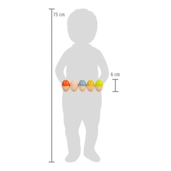 5 œufs de musique en solide bois massif pour secouer, tinter et s’amuser. Chaque oeuf fait un son différent. De part leur taille, les œufs sont particulièrement faciles à saisir par les mains d’enfant, une combinaison attrayante de bois naturel et de tons modernes. Ce jouet encourage la perception acoustique ainsi que la coordination oeil-main et développe le sens du rythme et du tact.