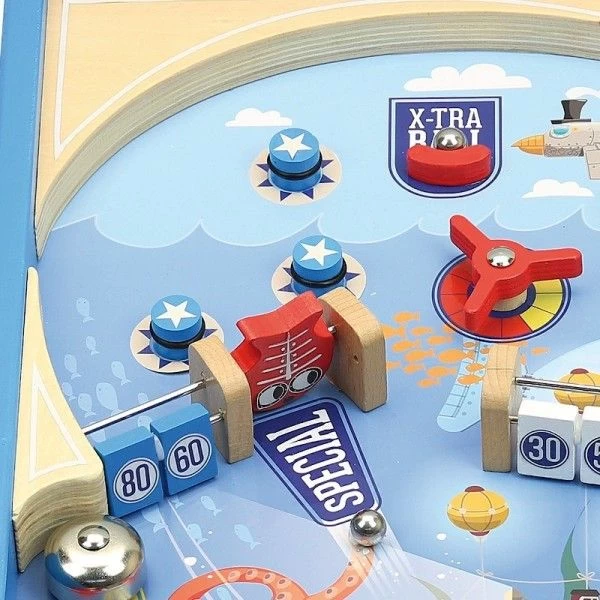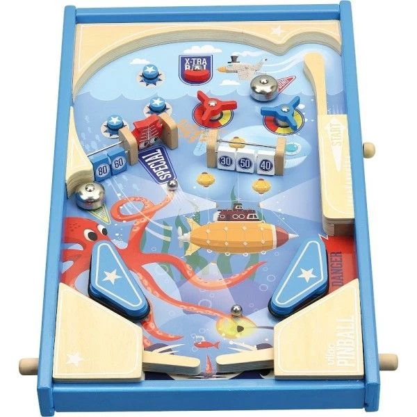 Comme les grands ! Ce flipper en bois à poser est livré avec 3 billes en métal pour dégommer les cibles, actionner les clochettes, emporter les tourniquets… Marquez le plus de points et remportez la bataille sous la mer! Pour augmenter la vitesse des billes et donc la difficulté du jeu, il suffit d’accentuer l’inclinaison du flipper avec les pieds amovibles.