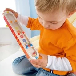 - Jeu d’adresse : faire passer les petites billes à travers les trous et amener les grosses billes sur les trous de couleur correspondante.
