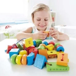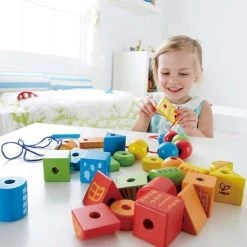 Pour les petits créateurs dés 36 mois, éveil émotionnel et physique avec ce Jouet en bois Formes à enfiler Hape®. Un cordon pour enfiler de jolis cubes de bois aux couleurs acidulés et créer selon l’inspiration du jour un train, une chenille, une tour…. Les 32 pièces en bois de hêtres de taille idéale pour les petites mains et décorées de petits nuages, de fleurs et autres décors inspirant, faisant de ce jouet un jeu de qualité solide et intemporel, dédié à l’apprentissage et à l’éveil. un jeu qui développe la motricité fine et la dextérité des petites mains.