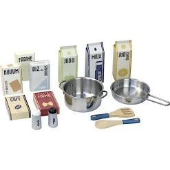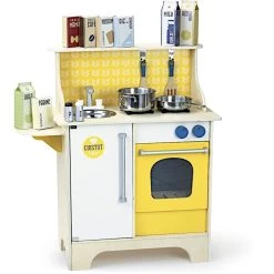 Pour les petits cuisiniers gourmands et écolos dés 36 mois, éveil émotionnel et imagination avec cette superbe Jouets en bois Dinette Cuisine Cuistot Moutarde Vilac®. Une magnifique cuisine en bois et tous les ustensiles nécessaires pour préparer de bons repas. Un design vintage avec sa crédence jaune et les poignées de placard imitation zinc. Devient un top-cuistot ! Avec les 14 accessoires : 1 salière et 1 poivrière sonores en bois, 1 spatule et 1 cuillère en bois, 1 faitout et 1 poêle en métal, 8 mini pack en carton. Le bruitage sonore des boutons apporte encore davantage de réalisme.